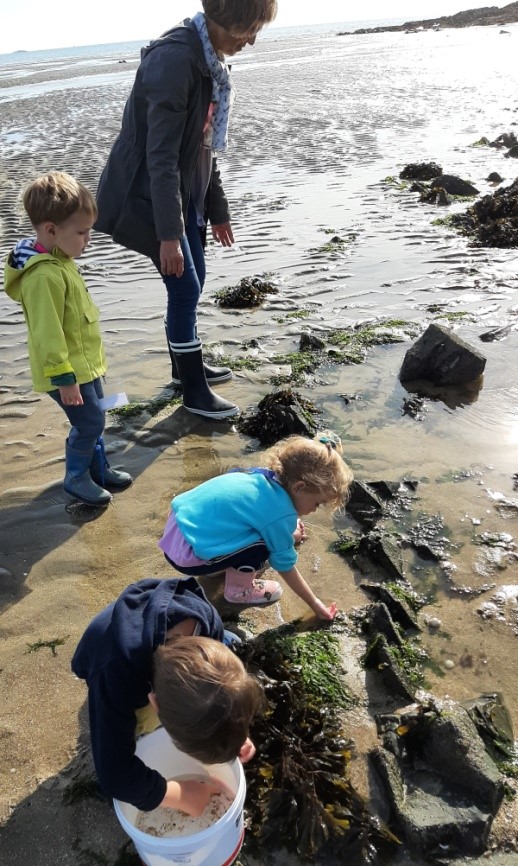 Puis, nous avons pêché dans les mares d’eau de mer. Nous avons pu voir des crevettes grises, des escargots de mer, une étoile de mer, des moules, un crabe vert, des coquilles St Jacques, une coquille de couteau, une huître, des anémones, des algues et des poissons « blennie ».
